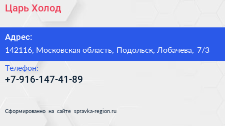 Царь Холод по адресу 142116, Московская область, Подольск, Лобачева, 7/3 в дальнейшем Организация, размещена в следующих категориях: