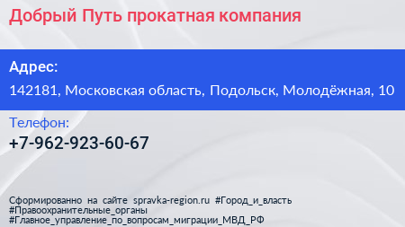 Добрый Путь, прокатная компания по адресу 142181, Московская область, Подольск, Молодёжная, 10 в дальнейшем Организация, размещена в следующих категориях: