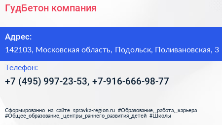 ГудБетон, компания по адресу 142103, Московская область, Подольск, Поливановская, 3 в дальнейшем Организация, размещена в следующих категориях: