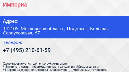 Импориа по адресу 142105, Московская область, Подольск, Большая Серпуховская, 67 в дальнейшем Организация, размещена в следующих категориях: