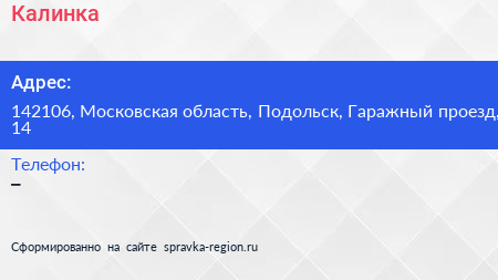 Калинка по адресу 142106, Московская область, Подольск, Гаражный проезд, 14 в дальнейшем Организация, размещена в следующих категориях: