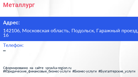 Металлург по адресу 142106, Московская область, Подольск, Гаражный проезд, 16 в дальнейшем Организация, размещена в следующих категориях: