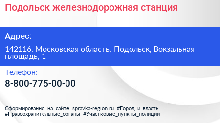 Подольск, железнодорожная станция по адресу 142116, Московская область, Подольск, Вокзальная площадь, 1 в дальнейшем Организация, размещена в следующих категориях: