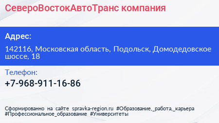 СевероВостокАвтоТранс, компания по адресу 142116, Московская область, Подольск, Домодедовское шоссе, 18 в дальнейшем Организация, размещена в следующих категориях: