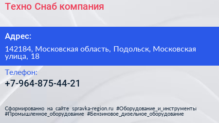 Техно-Снаб, компания по адресу 142184, Московская область, Подольск, Московская улица, 18 в дальнейшем Организация, размещена в следующих категориях: