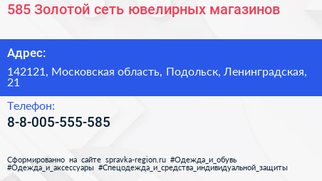 585*Золотой, сеть ювелирных магазинов по адресу 142121, Московская область, Подольск, Ленинградская, 21 в дальнейшем Организация, размещена в следующих категориях: