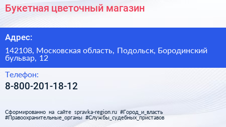 Букетная, цветочный магазин по адресу 142108, Московская область, Подольск, Бородинский бульвар, 12 в дальнейшем Организация, размещена в следующих категориях: