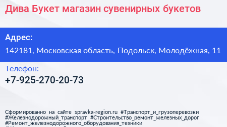 Дива Букет, магазин сувенирных букетов по адресу 142181, Московская область, Подольск, Молодёжная, 11 в дальнейшем Организация, размещена в следующих категориях: