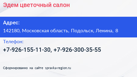 Эдем, цветочный салон по адресу 142180, Московская область, Подольск, Ленина, 8 в дальнейшем Организация, размещена в следующих категориях: