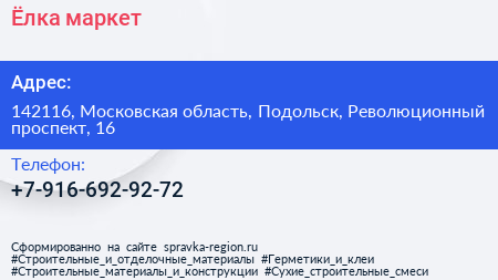 Ёлка-маркет по адресу 142116, Московская область, Подольск, Революционный проспект, 16 в дальнейшем Организация, размещена в следующих категориях: