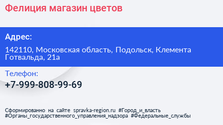 Фелиция, магазин цветов по адресу 142110, Московская область, Подольск, Клемента Готвальда, 21а в дальнейшем Организация, размещена в следующих категориях: