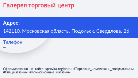 Галерея, торговый центр по адресу 142110, Московская область, Подольск, Свердлова, 26 в дальнейшем Организация, размещена в следующих категориях: