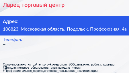 Ларец, торговый центр по адресу 108823, Московская область, Подольск, Профсоюзная, 4а в дальнейшем Организация, размещена в следующих категориях: