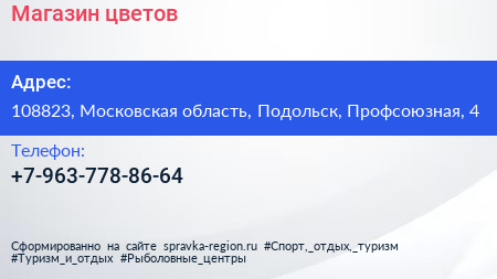 Магазин цветов по адресу 108823, Московская область, Подольск, Профсоюзная, 4 в дальнейшем Организация, размещена в следующих категориях: