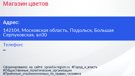 Магазин цветов по адресу 142104, Московская область, Подольск, Большая Серпуховская, вл30 в дальнейшем Организация, размещена в следующих категориях: