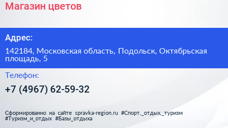 Магазин цветов по адресу 142184, Московская область, Подольск, Октябрьская площадь, 5 в дальнейшем Организация, размещена в следующих категориях: