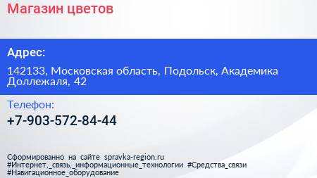 Магазин цветов по адресу 142133, Московская область, Подольск, Академика Доллежаля, 42 в дальнейшем Организация, размещена в следующих категориях: