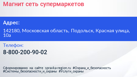 Магнит, сеть супермаркетов по адресу 142180, Московская область, Подольск, Красная улица, 10а в дальнейшем Организация, размещена в следующих категориях:
