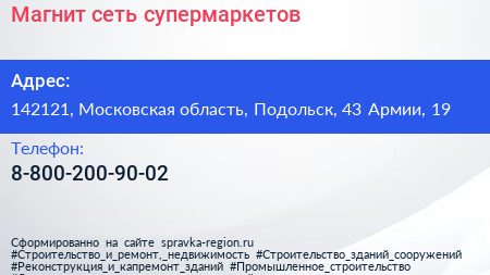 Магнит, сеть супермаркетов по адресу 142121, Московская область, Подольск, 43 Армии, 19 в дальнейшем Организация, размещена в следующих категориях: