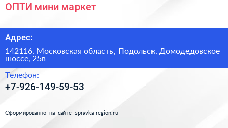 ОПТИ, мини-маркет по адресу 142116, Московская область, Подольск, Домодедовское шоссе, 25в в дальнейшем Организация, размещена в следующих категориях: