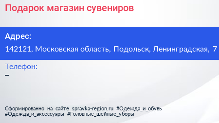 Подарок, магазин сувениров по адресу 142121, Московская область, Подольск, Ленинградская, 7 в дальнейшем Организация, размещена в следующих категориях: