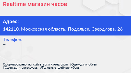 Realtime, магазин часов по адресу 142110, Московская область, Подольск, Свердлова, 26 в дальнейшем Организация, размещена в следующих категориях: