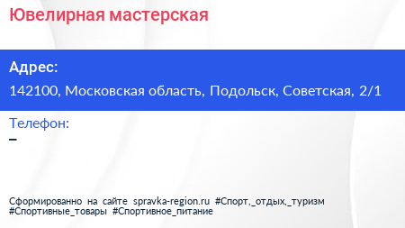 Ювелирная мастерская по адресу 142100, Московская область, Подольск, Советская, 2/1 в дальнейшем Организация, размещена в следующих категориях: