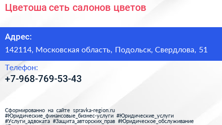 Цветоша, сеть салонов цветов по адресу 142114, Московская область, Подольск, Свердлова, 51 в дальнейшем Организация, размещена в следующих категориях: