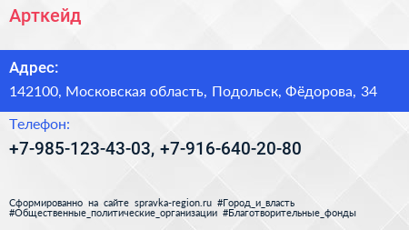 Арткейд по адресу 142100, Московская область, Подольск, Фёдорова, 34 в дальнейшем Организация, размещена в следующих категориях: