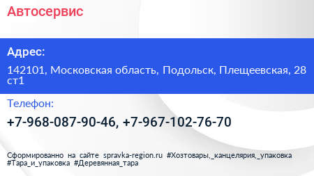 Автосервис по адресу 142101, Московская область, Подольск, Плещеевская, 28 ст1 в дальнейшем Организация, размещена в следующих категориях: