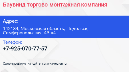 Баувинд, торгово-монтажная компания по адресу 142184, Московская область, Подольск, Симферопольская, 49 к4 в дальнейшем Организация, размещена в следующих категориях: