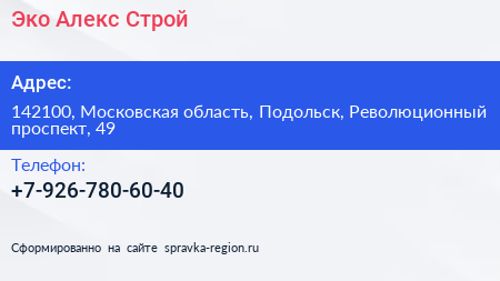 Эко Алекс Строй по адресу 142100, Московская область, Подольск, Революционный проспект, 49 в дальнейшем Организация, размещена в следующих категориях: