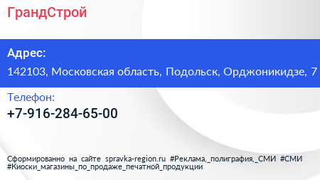 ГрандСтрой по адресу 142103, Московская область, Подольск, Орджоникидзе, 7 в дальнейшем Организация, размещена в следующих категориях: