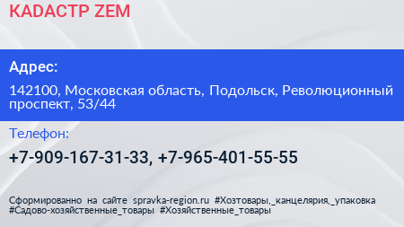КADAСТР-ZEM по адресу 142100, Московская область, Подольск, Революционный проспект, 53/44 в дальнейшем Организация, размещена в следующих категориях: