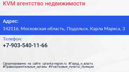 KVM, агентство недвижимости по адресу 142116, Московская область, Подольск, Карла Маркса, 3 в дальнейшем Организация, размещена в следующих категориях: