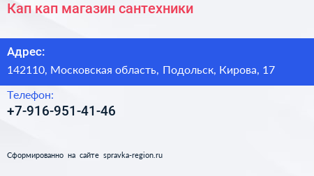 Кап-кап, магазин сантехники по адресу 142110, Московская область, Подольск, Кирова, 17 в дальнейшем Организация, размещена в следующих категориях: