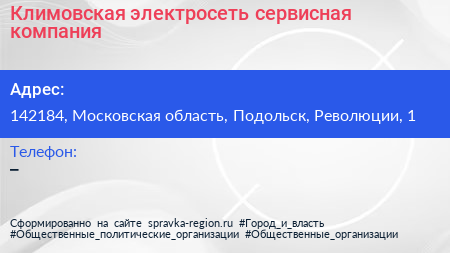 Климовская электросеть, сервисная компания по адресу 142184, Московская область, Подольск, Революции, 1 в дальнейшем Организация, размещена в следующих категориях: