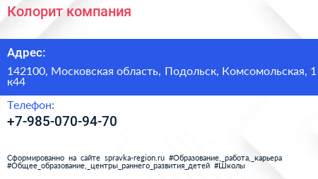 Для связи с организацией воспользуйтесь номером телефона: +7-985-070-94-70. Пн: c 09:00-21:00, Вт: c 09:00-21:00, Ср: c 09:00-21:00, Чт: c 09:00-21:00, Пт: c 09:00-21:00, Сб: c 09:00-21:00, Вс: выходной, вы можете обратиться в эту организацию.