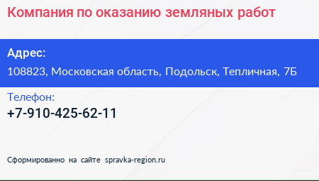 Компания по оказанию земляных работ по адресу 108823, Московская область, Подольск, Тепличная, 7Б в дальнейшем Организация, размещена в следующих категориях: