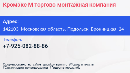 Кромэкс-М, торгово-монтажная компания по адресу 142103, Московская область, Подольск, Бронницкая, 24 в дальнейшем Организация, размещена в следующих категориях: