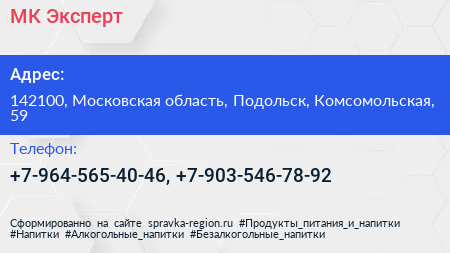 МК-Эксперт по адресу 142100, Московская область, Подольск, Комсомольская, 59 в дальнейшем Организация, размещена в следующих категориях: