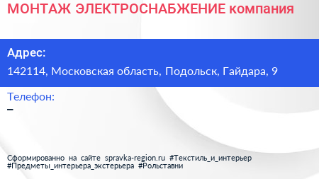 МОНТАЖ ЭЛЕКТРОСНАБЖЕНИЕ, компания по адресу 142114, Московская область, Подольск, Гайдара, 9 в дальнейшем Организация, размещена в следующих категориях:
