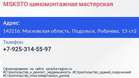 MSKSTO, шиномонтажная мастерская по адресу 142116, Московская область, Подольск, Лобачева, 13 ст2 в дальнейшем Организация, размещена в следующих категориях: