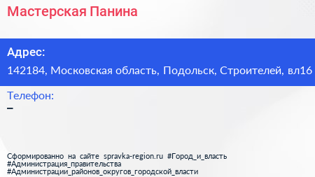 Мастерская Панина по адресу 142184, Московская область, Подольск, Строителей, вл16 в дальнейшем Организация, размещена в следующих категориях:
