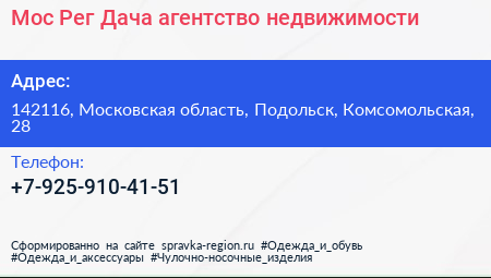 Мос Рег Дача, агентство недвижимости по адресу 142116, Московская область, Подольск, Комсомольская, 28 в дальнейшем Организация, размещена в следующих категориях: