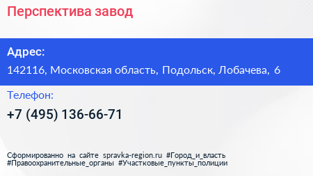 Перспектива, завод по адресу 142116, Московская область, Подольск, Лобачева, 6 в дальнейшем Организация, размещена в следующих категориях: