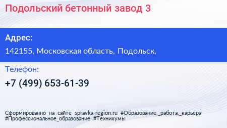 Подольский бетонный завод №3 по адресу 142155, Московская область, Подольск, в дальнейшем Организация, размещена в следующих категориях: