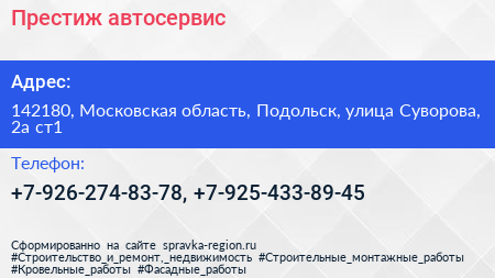 Престиж, автосервис по адресу 142180, Московская область, Подольск, улица Суворова, 2а ст1 в дальнейшем Организация, размещена в следующих категориях: