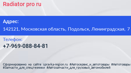 Radiator-pro.ru по адресу 142121, Московская область, Подольск, Ленинградская, 7 в дальнейшем Организация, размещена в следующих категориях: