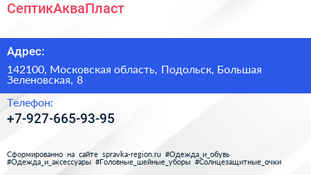 СептикАкваПласт по адресу 142100, Московская область, Подольск, Большая Зеленовская, 8 в дальнейшем Организация, размещена в следующих категориях: